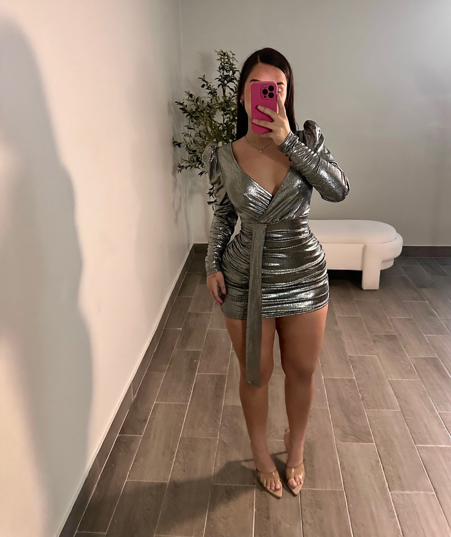 Corre normal, estira, arrugado en caderas, puedes manejar su largo, metálico y tiene zipper en espalda.